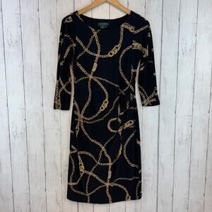 LRL Ralph Lauren Black Gold Chain Link Equestrian Sheath Dress Stretch Size 6