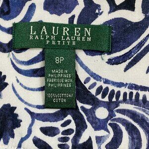 This Lauren Ralph Lauren skirt is a knee-length, full flare style made of lightweight cotton with a blue and white batik floral pattern. Designed for petites in size 8P, it features a zip closure and pockets. Perfect for various occasions like travel, parties, or casual and business settings. The skirt embodies themes of career-wear, flower, and cottagecore, making it a versatile and stylish addition to your wardrobe.