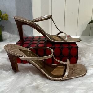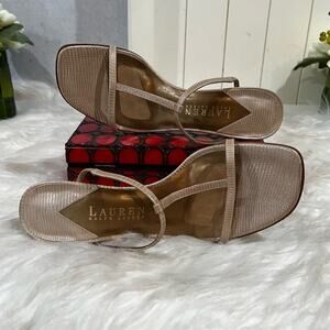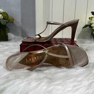 LRL Ralph Lauren Leather T-Strap Metallic High Heel Snakeskin Slides Sandals 5.5
