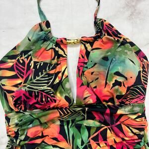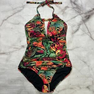 LRL Ralph Lauren Midnight Tropical High Neck One Piece Swimsuit Size 8 Keyhole