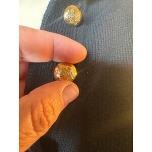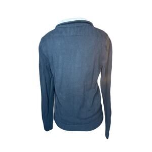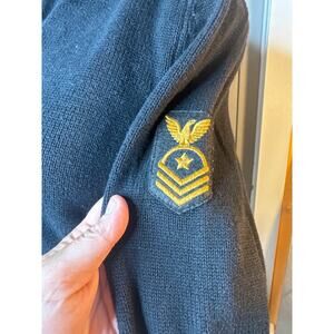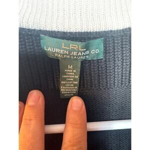 LRL Lauren Jeans Co. by Ralph Lauren women’s sweater in size Medium. Made from 100% cotton (green tag), featuring a classic blue waffle knit pattern. Designed with a cream pop collar and a stylish 1/4 button front accented by four gold-tone buttons. Unique detail: U.S. Navy Senior Chief Petty Officer (SCPO) insignia patch on the left shoulder, adding a rare and collectible military-inspired touch.
