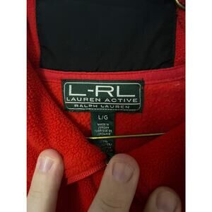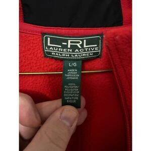 LRL Ralph Lauren active fleece jacket large 100% polyester. This is a very nice jacket with no visible wear or stains.
