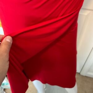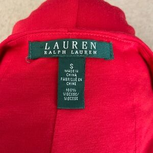 Lauren Ralph Lauren Side Ruched Faux Wrap Sheath Dress. Sleeveless. V Neckline. Ruched Side. Faux Wrap Skirt with Lining. 100% Viscose. Midi Length. Stretchy. Figure Flattering. Great Pop of Color. In Very Good Condition.