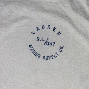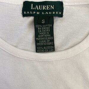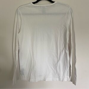 This Lauren by Ralph Lauren white long sleeve tee features a simple navy circular logo on the chest, adding a touch of whimsy to its minimalist design. Made from 100% cotton, it offers a comfortable fit with a classic crew neckline, perfect for casual everyday wear.