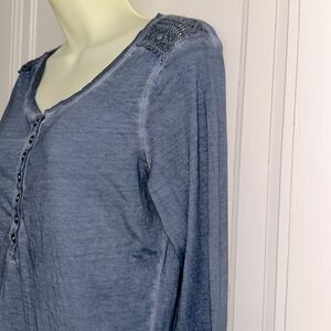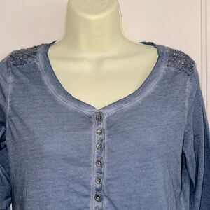 LRL Lauren Jeans Co Ralph Lauren Washed Out Denim Look Blue Button Front Thin Cotton Knit Top with 3/4 sleeves & Lace insets on shoulders