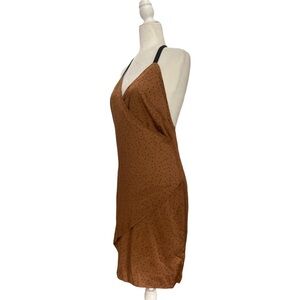 Beautiful LèRumi Gene Tan Spot Mini Dress featuring a halter neckline with self tie back, an alluring open back, back covered button closure, asymmetrical front hem, partially lined. Faux Wrap Styling