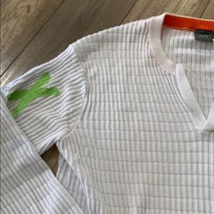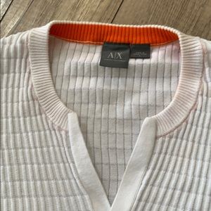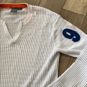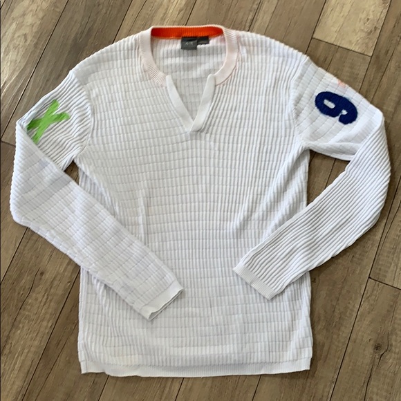 A/X. White ribbed L/S Pullover. Cut V Neck. A/X print on one sleeve. 91 print on other.