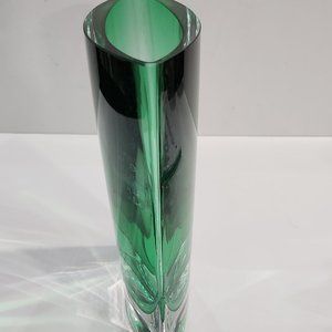 A very gorgeous grass green thin oval (ovoid) shaped glass vase made by LSA International. The Weighty base is clear. This vase was handcrafted and mouth blown in Poland. I, as a former florist, see this as a perfect vase for cut flowers. The green color will complement most every flower color. Size: 8 1/4 inch tall, 5