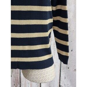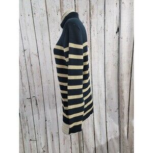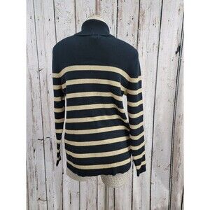 Ralph Lauren turtleneckBlack with metallic gold stripesRibbed, stretchy materialGreat preowned condition; no stains, tears or odors.