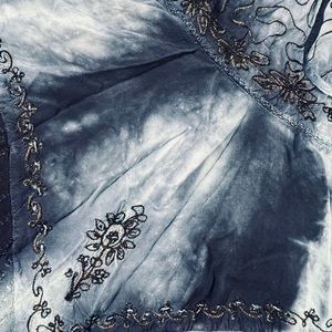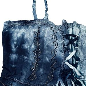 L.S.I. size L/Xl dark/light blue & white spaghetti strap tie dye design mini dress with jagged hem, corset top, lace up in the front, elastic band in the back, lace detailing, black & silver floral & squiggly lines stitching designs all over, winched waist, sparkly, this is a beautiful dress! Great used condition, like new!