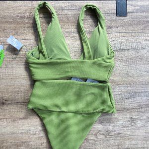 Style is the desi high waist bottom and fisher triangle top in olive green. Texture/fabric is ribbed
