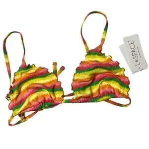 In classic California style, the L*Space Under The Sun Maggie Bikini Top features a triangle style fit with sliding cups, wavy lettuce edge detailing, adjustable over the shoulder straps and back tie in colorful striped print. Fully lined.