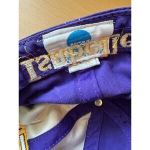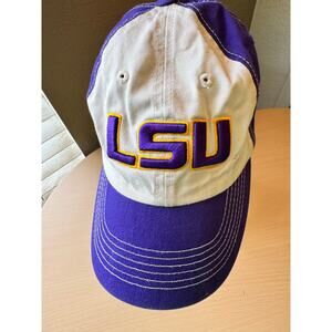 Show your LSU pride with this NCAA Tigers cap. The hat features a two-tone design with a purple bill and back panels, and a light gray front embroidered with bold purple and gold "LSU" lettering. The back includes a detailed LSU tiger mascot logo and an adjustable strap for a custom fit. The inside tag reads “Isabelle,” and there is an official NCAA label on the strap.