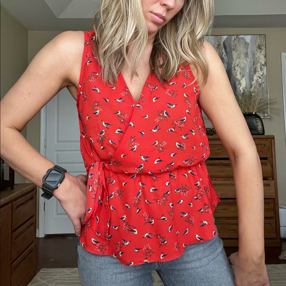 Very brightly colored summer top. Great for a party especially with white pants and brown sandals. Also love the peplum style for when I had just had a baby.