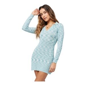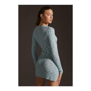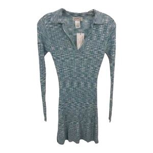 This slim fit mini with A line silhouette and side slits features slim sleeves and a deep ribbed V neck and collar, and can be kept casual with sandals or dressed up with heels.