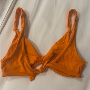 Top size D Cup, bottoms size large, but both run small! Would easily fit a size down. Bright tangerine color. Worn a few times but in good condition, just wrinkly in photos from being in my drawer during winter. Top is the Turner and bottoms are La Jolla.