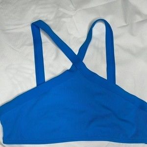 Stylish blue bikini top by L*Space. Features cross-back straps. Perfect for beach days.