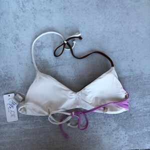 Stylish colorblock bikini top. Features adjustable tie straps. Perfect for beach days.
