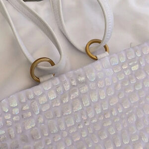 The Indiana is an ultra-modern, one shoulder bikini top featuring a fabric ring accent on adjustable dual straps. A textured, glossy gator print adds a little extra edge.