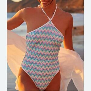 Brand new Mirabella crochet Chevron swimsuit from L*SPACE. Halter tie neck with beads on the ends. White, blue, pink, and teal ombré Chevron stitched pattern.