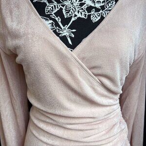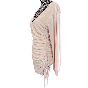 Check out this gorgeous light warm pink mini dress with a flattering ruched side with ties, long sleeves, and plunging neckline. Fabric is very stretchy and with a subtle shimmer and ultra soft on the inside. Color is Seashell Blush, size is Medium.
