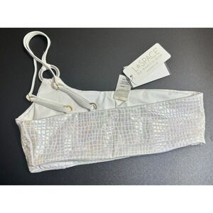 New with tags L*Space Indiana Bikini Top in Opalescent Gator Gloss Size XS MSRP $99. Fully lined. Asymmetrical double strap with Hoop detail, gold metal hardware. Iridescent/Opalescent textured fabric. Asymmetrical double strap with Hoop detail.
