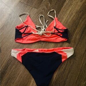 Stylish navy and coral bikini set perfect for a day at the beach. Features a comfortable fit and vibrant colors.