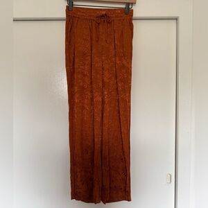 details: Bronze palm print wide leg pants with elastic waist and tie details.