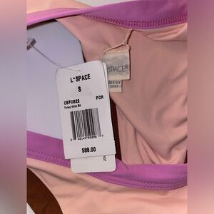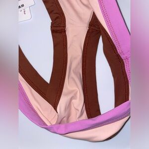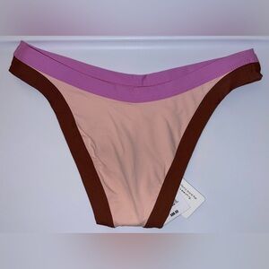 Stylish bikini bottom by L*Space. Features a pink center with brown trim. Perfect for a chic beach look.