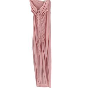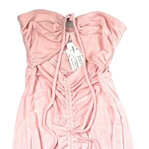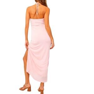 Shimmer from day to night in the Stina Dress. With fixed shirring down the center front, this halter dress constructed from shine material comes with a silicone grip at the top edge of the bodice and can be worn strapless or tied around the neck. Featuring a cutout and keyhole accented with a tortoise ring under the bust and a slit opening at the front, you’ll bring the right amount of sophisticated sexy wherever you go.