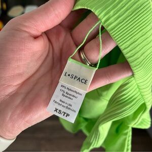 DETAILS: L*Space Swimsuit women's XS, Katniss style in neon green, cheeky bum, plunging v neck, slim tank straps. Nylon spandex.