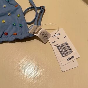 L*Space Women’s L Brittany Triangle String Bikini Top Light Blue Beaded Flowers