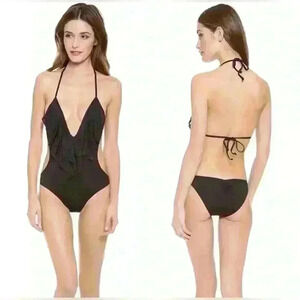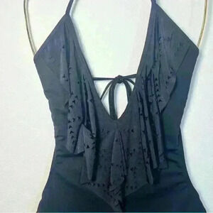 Great condition. One piece monokini halter with plunging neckline, featuring a laser cut flounce.