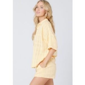 The perfect summer set, we are obsessed with the L*Space Golden Hour Gene Set, featuring a button front short sleeve top with collar and rolled sleeves and matching elastic waist shorts with adjustable drawcord and convenient pockets in a picnic plaid 100% cotton fabric.