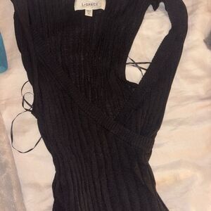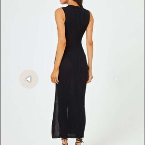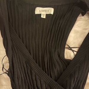This sophisticated black sheath maxi dress by L*Space features a striking V-neckline and a high side slit, perfect for cocktail parties or a night out. Its sleeveless design and form-fitting silhouette offer a sleek and elegant look, while the minimalist style ensures timeless appeal.