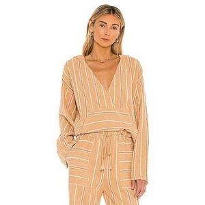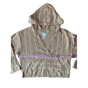 L*Space Paradise Sunrise Stripe Print Hooded Pullover, Size S petite. It can fit up to a M. Very cute textured allover stripe print woven hooded pullover. It has a flattering V-neckline, roomy oversized fit, full length long sleeves, and a kangaroo center pocket. New with out the tags, no flaws. Sold out on Revolve.