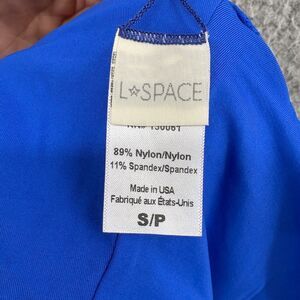 L*Space Ribbed Blue Bikini Top in size Small, made in the USA from 89% Nylon, 11% Spandex. It has a V-neck design, adjustable straps, and a ribbed fabric that fits well. Good for beach trips, pool days, or pairing with high-waisted shorts.