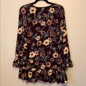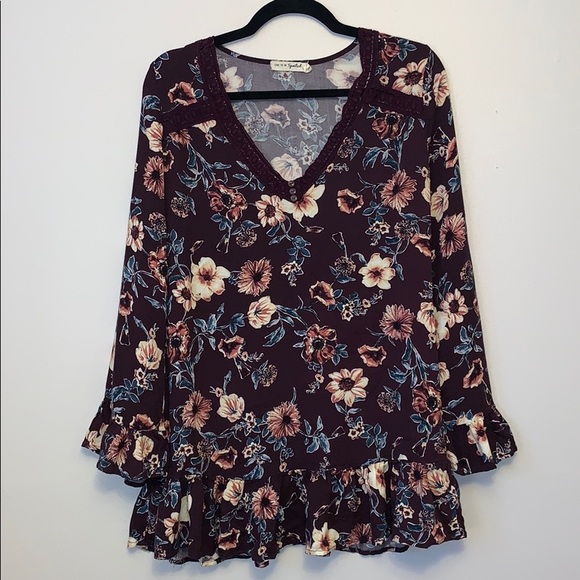 • Colors: Merlot, Mauve, Cream and Blue • Ruffle sleeves and hem • Soft material • Fits like a M/L