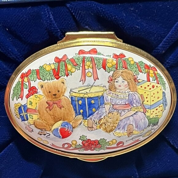 This charming limited edition enamel trinket box features a hinged lid, Christmas theme and personalized for Leslie. It is 2" wide.