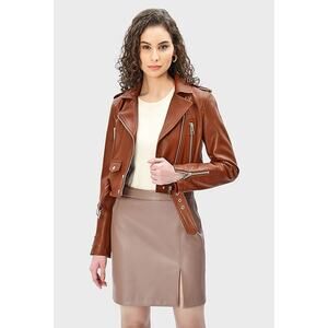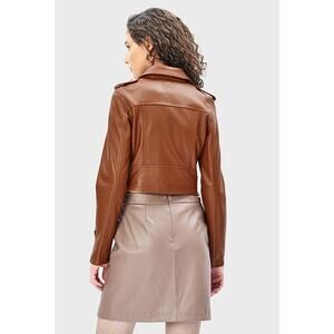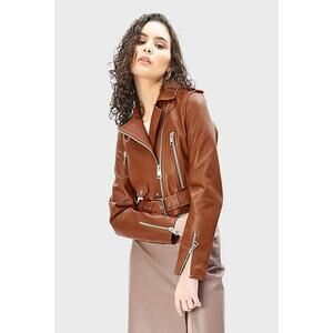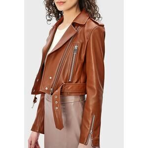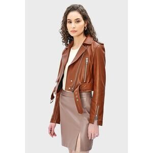 LTH JKT Mya Cropped Belted Leather Moto Jacket in Cognac Brown, Size XS