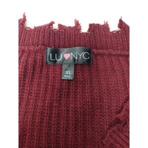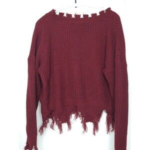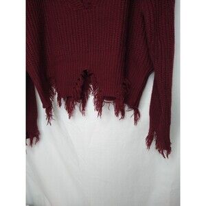 LU NYC V-Neck Crop Burgundy Sweater Size XL Fringe Grunge Distressed Chewed