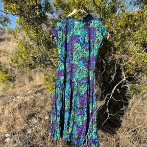 VTG 90S LUCI FELLINI MADE IN USA SZ 16 Vibrant PURPLE GREEN HAWAIIAN FLORAL DRESS WOMEN, Drop pleated waist