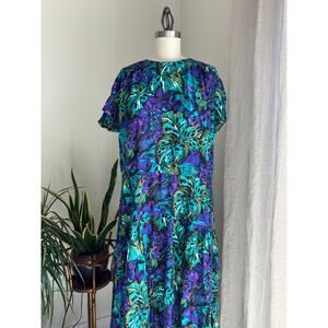 LUCI FELLINI Women's 16 Dress PURPLE GREEN HAWAIIAN FLORAL DRESS VTG 90S