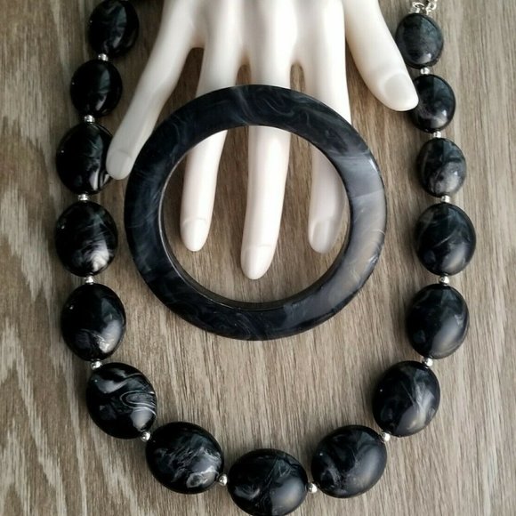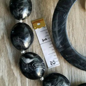 VINTAGE TO MODERN JEWELRY LOT. 1 MARBLED SAUCER STYLE LUCITE BANGLE BRACELET & CHUNKY MARBLED BEADED LUCITE NECKLACE. BOTH COORDINATE WELL TOGETHER. PRE-OWNED.