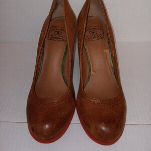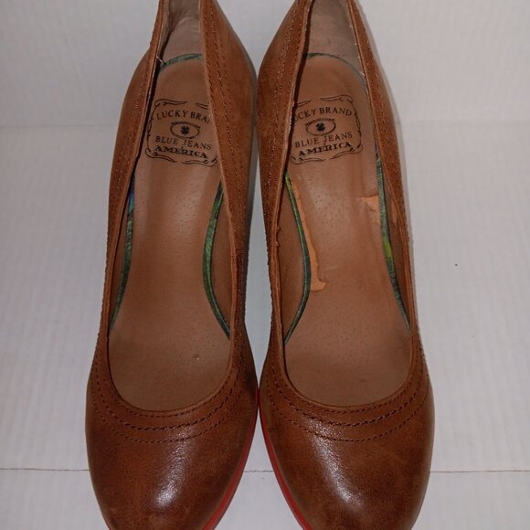 Size 8.5M - Women's Lucky Brand slip on boho heeled shoes with distressed look throughout shoes in a tarnish brown color with orange trim in pre-owned condition. Note some peeling in one shoe as seen in photos