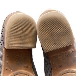 LUCKY BRAND Bootie. Perforated upper with side zippers on both sides. 1.5" heel. Size 9.5 / 39.5. Leather upper/synthetic lining/rubber sole. Kind of a taupe color. Good pre-owned condition with a few dings on the heels (see photos).