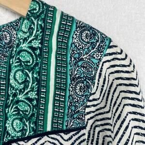 LUCKY BRAND Blouse M Paisley Chevron Peasant Boho 3/4 Sleeve Notch Cotton Green