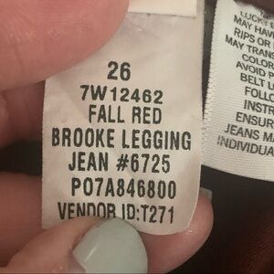 Size 2/26. Excellent condition - washed, pressed & ready to wear! Color is “Fall Red”. Zip front 5 pocket style. Skinny/jegging fit. Stretch - 64% Cotton, 33% Spandex, 3% Elastane. Approximate measurements (taken when laying flat - cannot guarantee fit):