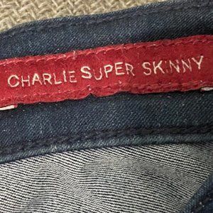 LUCKY BRAND * Charlie Super Skinny (don't let that scare you ~ only the ankle is "super" skinny). DARK Blue WASH * super soft (probably the softest jeans you'll ever have) 70%pcotton/28%poly/2%spandex with LOTS of stretch! Silver-tone metal LOGO buttons & zip fly ~ traditional 5-pocket style with blue embroidery across back pockets ~ little red cotton tag with white shamrock sewn on right back pocket. ** Lovingly worn but well taken care of. No rips, tears or stains except for the factory-intentional rubbed areas that are a little lighter in color (mostly at seams or edges of pockets).