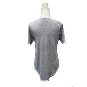 Def Leppard logo front and center on the chest with factory distressing (crackling of the logo), burnout, studs and metal embellishments throughout, high/low style with longer back hem, wide scoop neck, charcoal gray, thin, lightweight and semi sheer polyester/cotton blend.